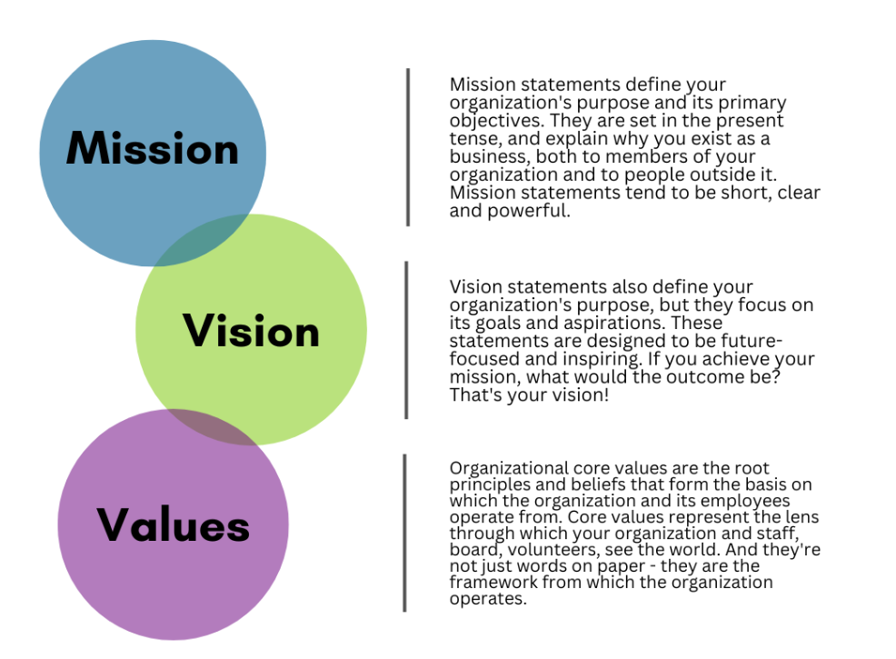 The mission and vision of an organization are relatively stable and do not change much over time. Core values, however, can shift or perhaps become more of a priority at times. For example, inclusivity has become a priority for many organizations within the social sector. Here’s an example of a values statement from the National Council of Nonprofits: